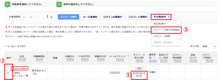 一括でマイページ発行予約を削除する場合は、対象の従業員の「選択」列(②)にチェックし、[その他操作]>[マイページ発行予約削除](③)>[削除]をクリックします。