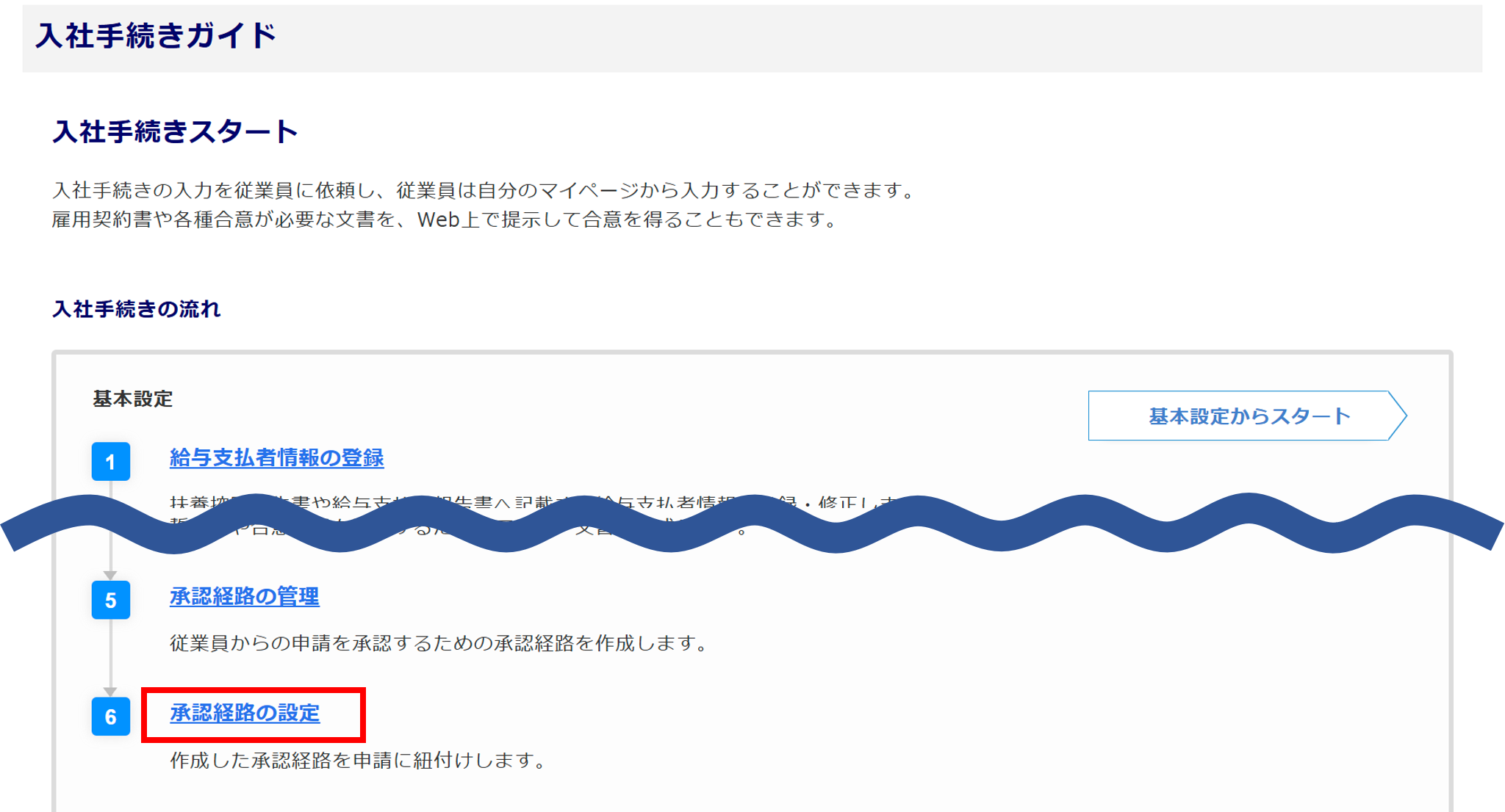 - [入社手続きガイド]から進んだ場合は、[承認経路の設定]をクリックします。