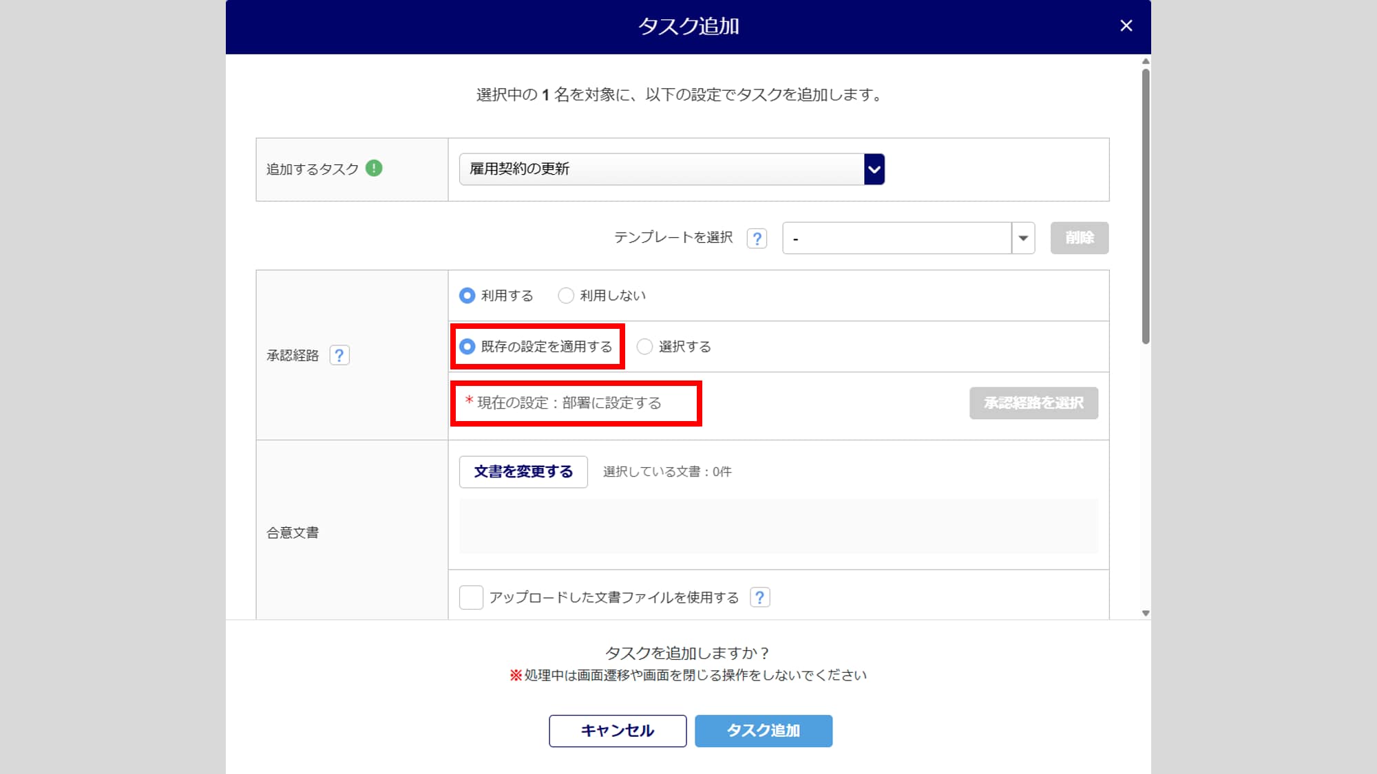 - 設定した申請種別のタスク発行時、「承認経路」項目にて「既存の設定を適用する」を選択すると、「現在の設定」に、「部署に設定する」と表示されます。