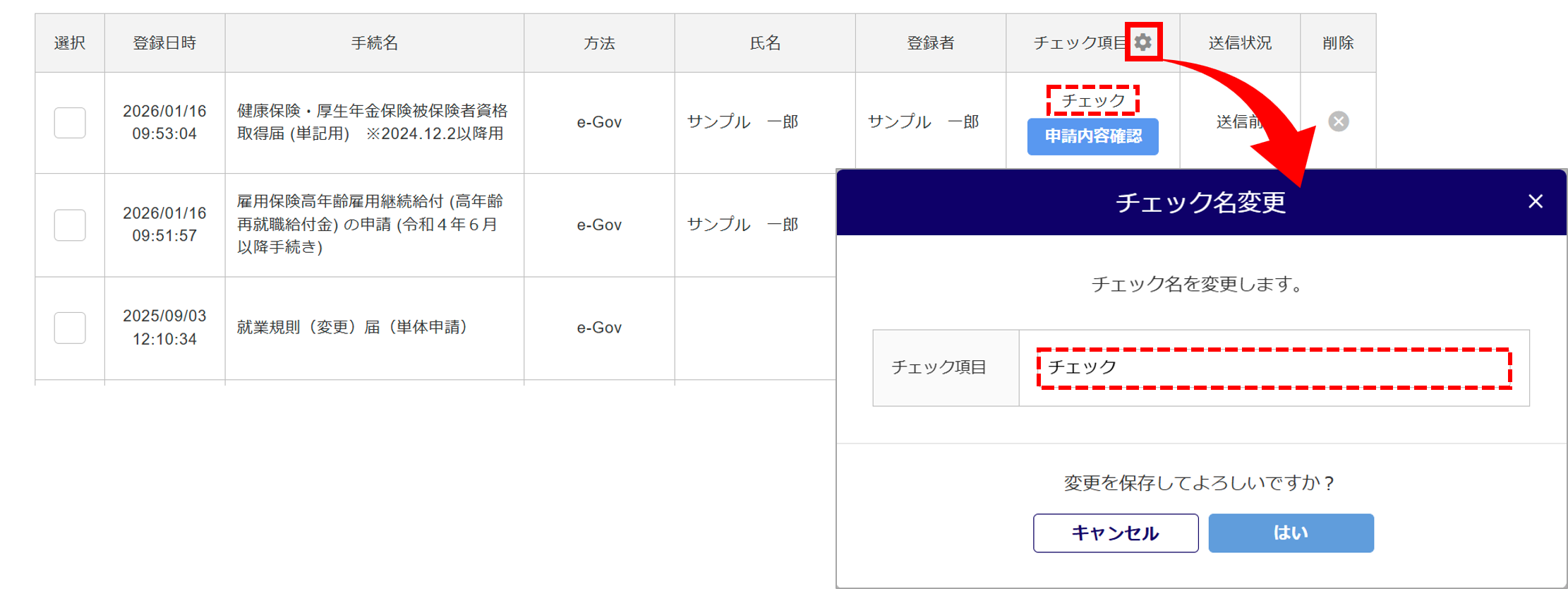 「チェック項目」横の[歯車マーク]をクリックすると、「チェック」の名称を変更できます。