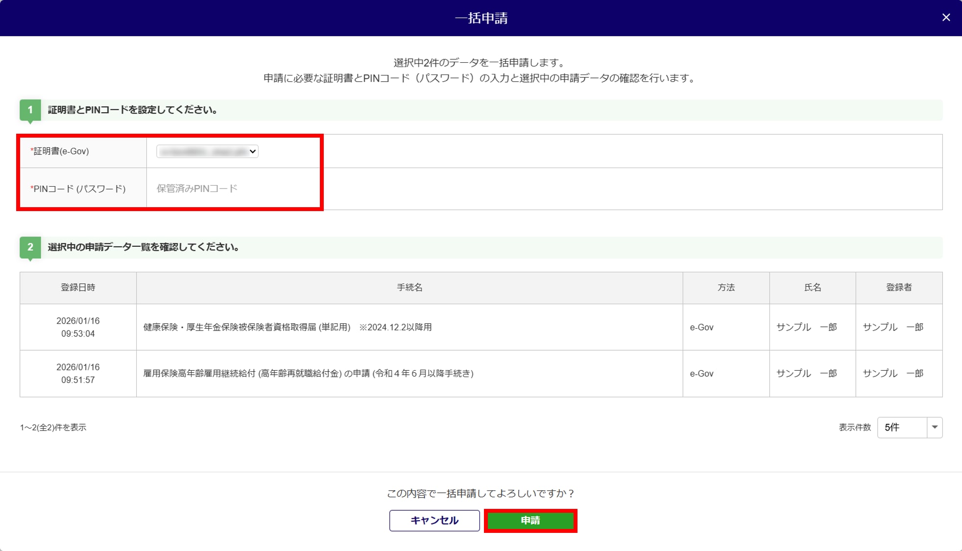 - 一覧にて、一括申請をおこなう手続きの「選択」列(1)にチェックし、[一括申請](2)をクリックします。