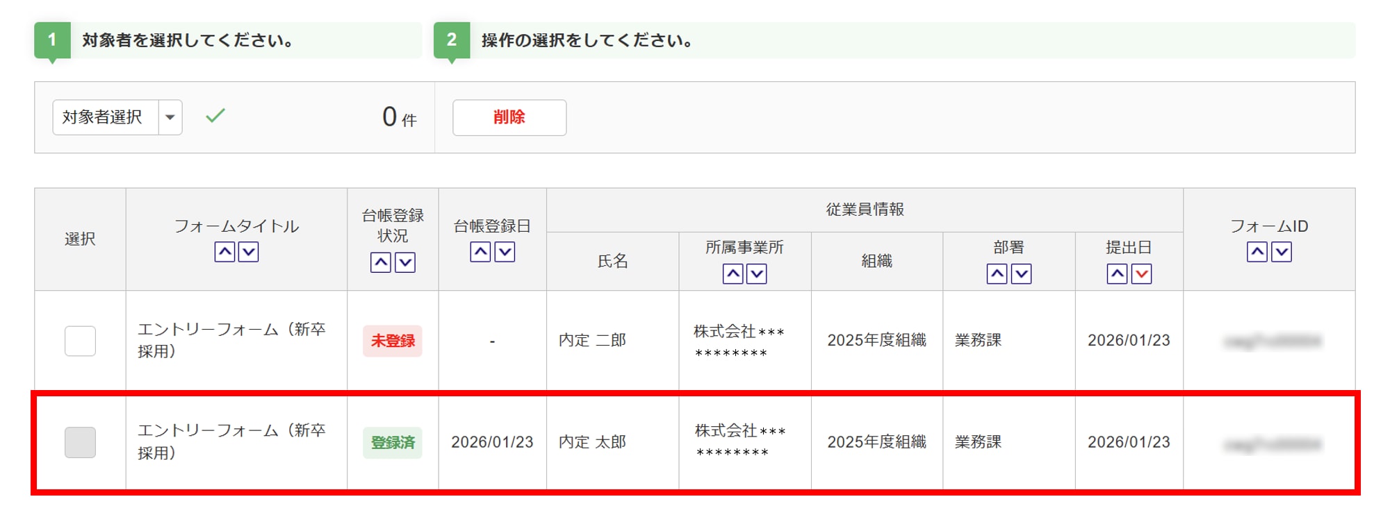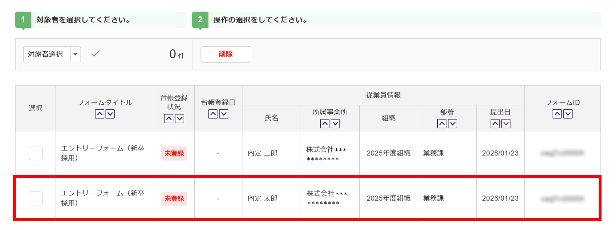 「エントリー管理一覧」画面の初期表示では、従業員台帳に未登録の情報のみが表示されています。