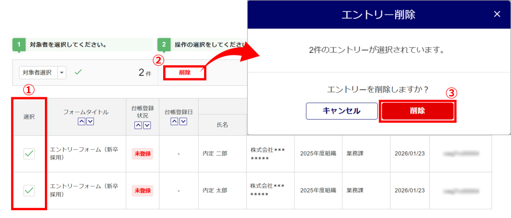 従業員から提出されたエントリーを削除する場合は、「選択」列(1)をチェックし、[削除](2)>[削除](3)をクリックします。