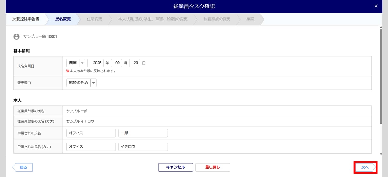 内容に問題がなければ、[次へ]をクリックします。 - 氏名変更