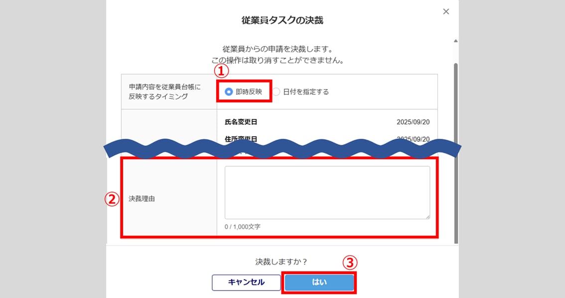 「申請内容を従業員台帳に反映するタイミング」に「即時反映」(①)を選択し、「決裁理由」(②)を入力、[はい](③)をクリックします。 - 申請内容を従業員台帳に日付指定で反映する場合