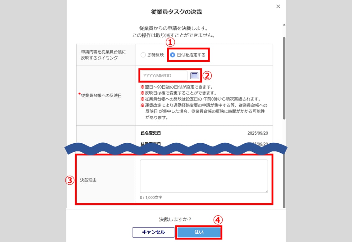 「申請内容を従業員台帳に反映するタイミング」に「日付を指定する」(①)を選択し、「従業員台帳への反映日」(②)を入力します。「決裁理由」(③)を入力し、[はい](④)をクリックします。