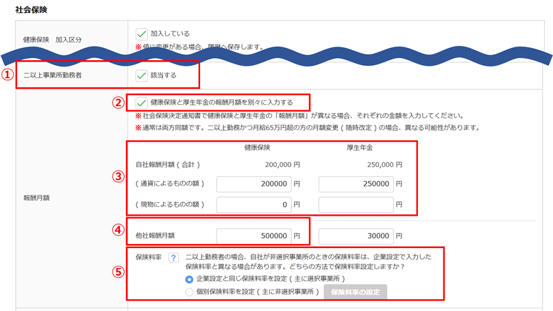 - 「社会保険」カテゴリの「二以上事業所勤務者」などを設定します。