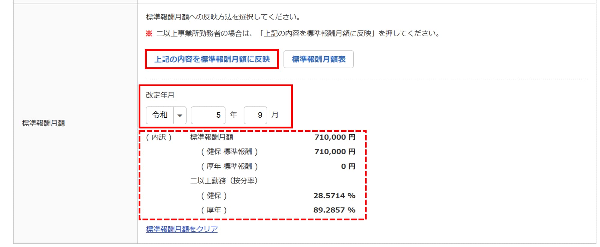 [上記の内容を標準報酬月額に反映]をクリックすることで、「報酬月額」で入力した「自社報酬月額」「他社報酬月額」の情報を基に「(内訳)」を反映することができます。二以上事業所勤務者としての設定は以上です。二以上事業所勤務者として登録し、健康保険と厚生年金の報酬月額を別々に入力している場合、それぞれの按分率を表示します。