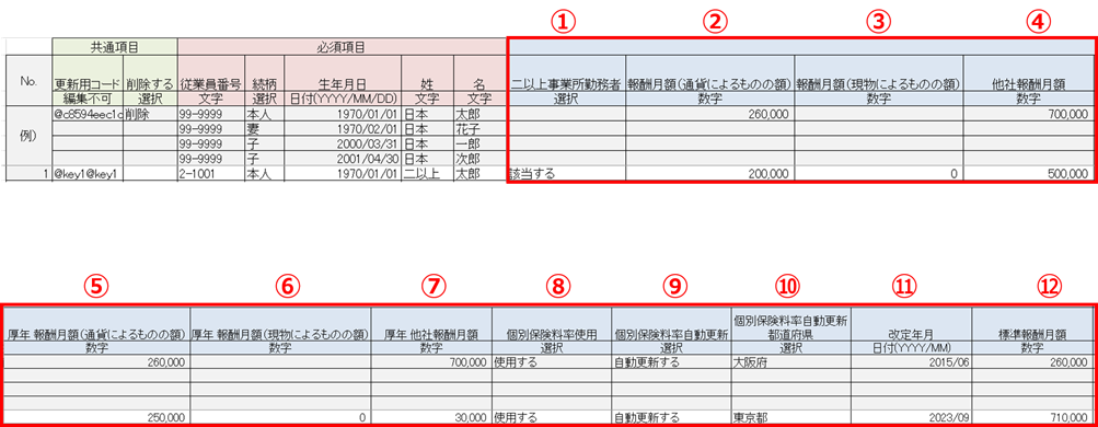 「従業員台帳一括編集」方法 - テンプレートの編集ダウンロードしたテンプレートファイルに、二以上事業所勤務者としての情報を編集します。