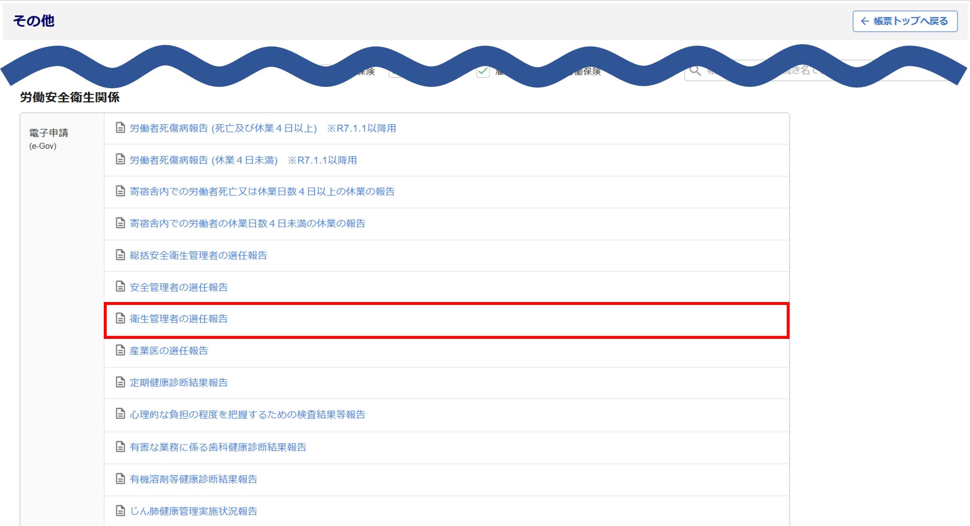 - 「労働安全衛生関係」カテゴリ内の「衛生管理者の選任報告」をクリックします。