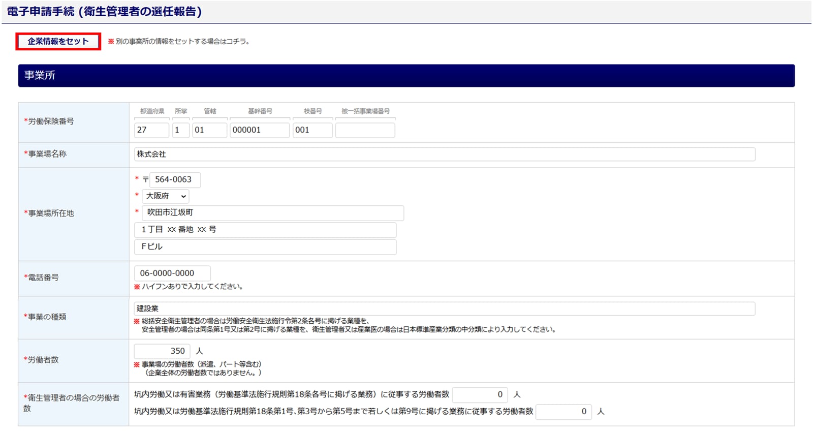 「電子申請手続確認 (衛生管理者の選任報告)」画面で[基本情報入力をスキップ]をクリックしている場合、このページは表示されません。