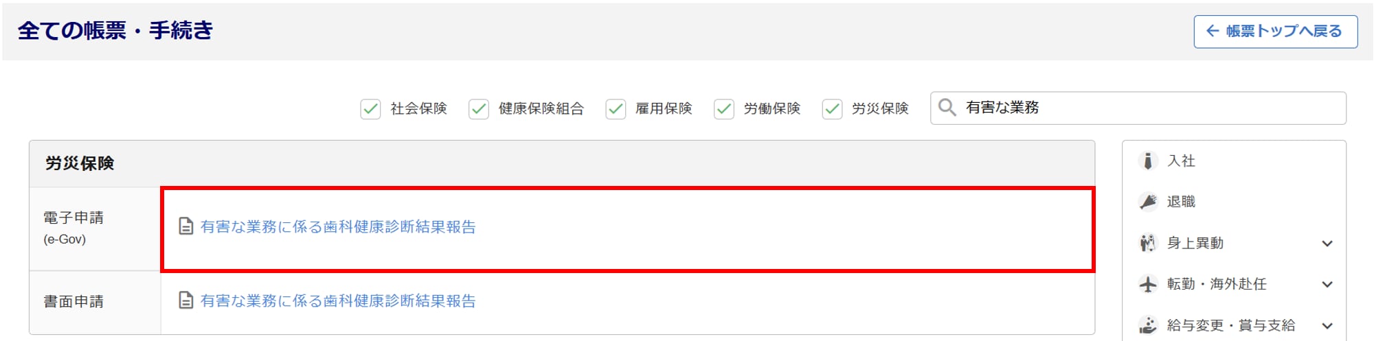 - 「有害な業務に係る歯科健康診断結果報告」をクリックします。