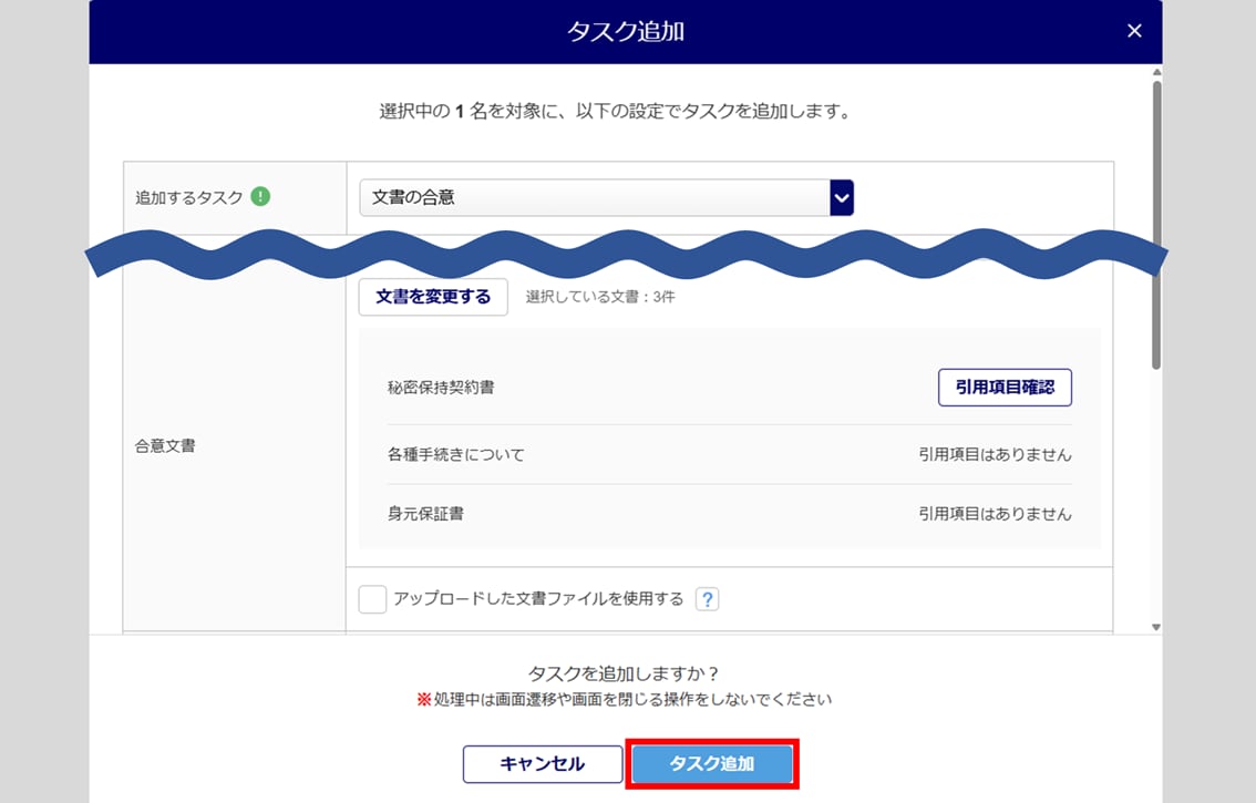 入力内容を確認し、[タスク追加]をクリックします。 - 「アップロードした文書ファイルを使用する」にチェックを入れている場合