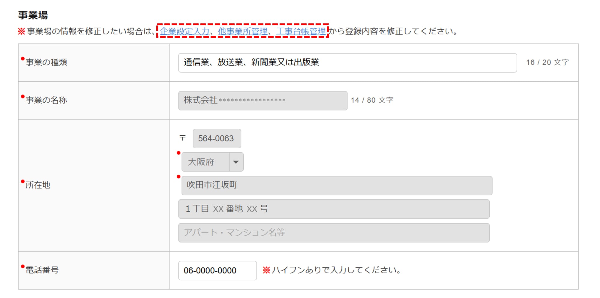 事業場の情報は、[事業場を選択]で選択した事業場情報を引用します。