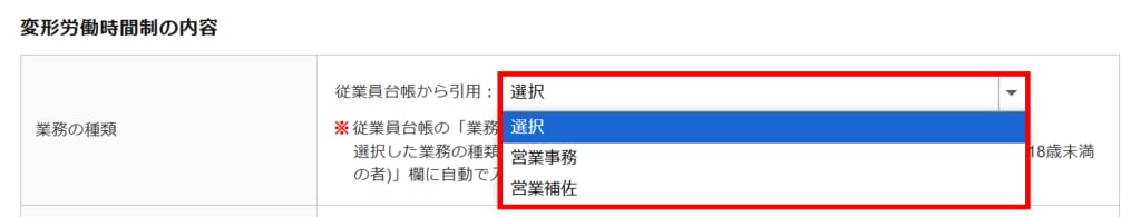従業員台帳の「業務の種類」を登録している場合に、選択できます。