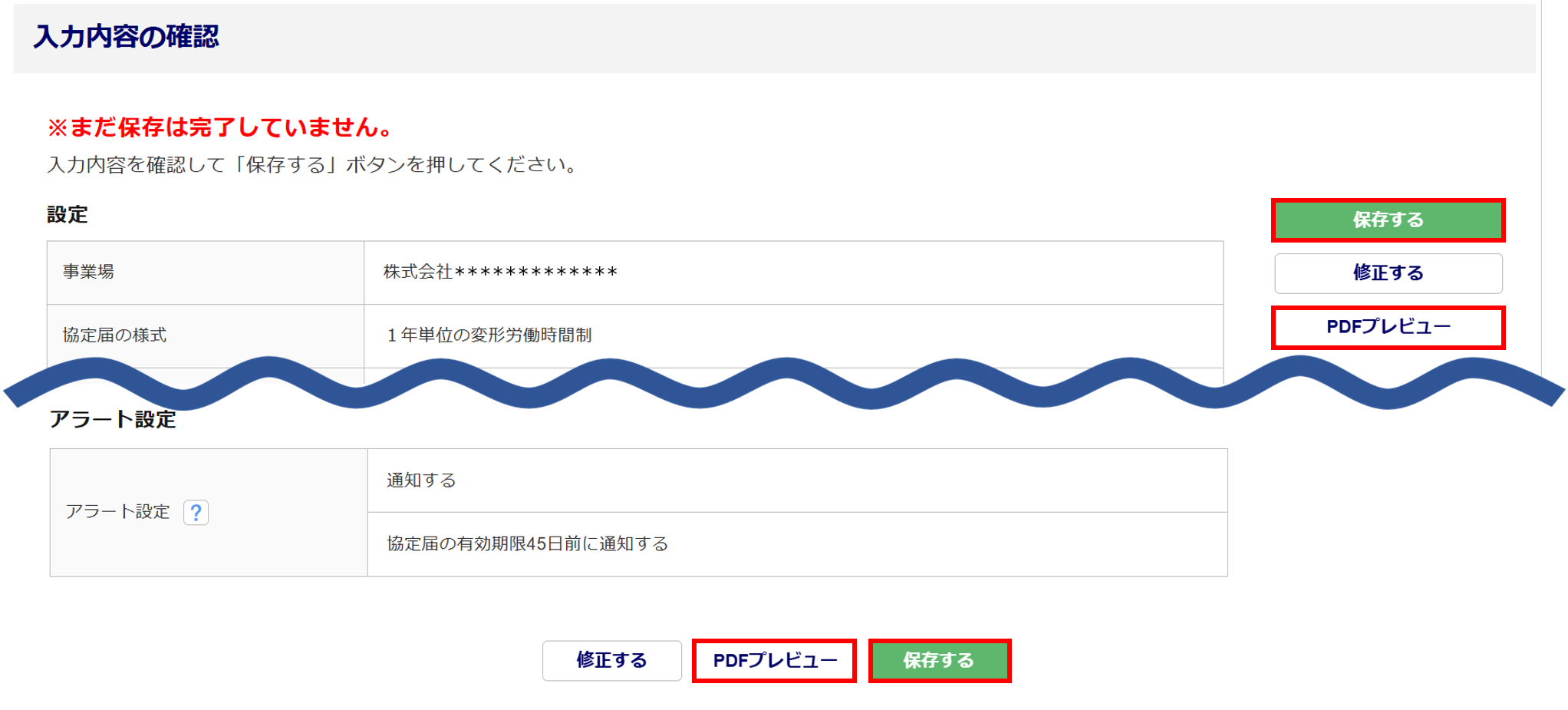[一覧に戻る]をクリックし、「協定届管理」画面から作成した協定届の編集をおこなってください。