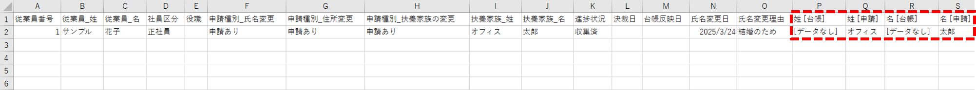 | 扶養家族_差分情報CSV | 「従業員番号」「従業員_姓」「従業員_名」「社員区分」「役職」「申請種別_氏名変更」「申請種別_住所変更」「申請種別_扶養家族の変更」「扶養家族_姓」「扶養家族_名」「進捗状況」「決裁日」「台帳反映日」「氏名変更日」 |