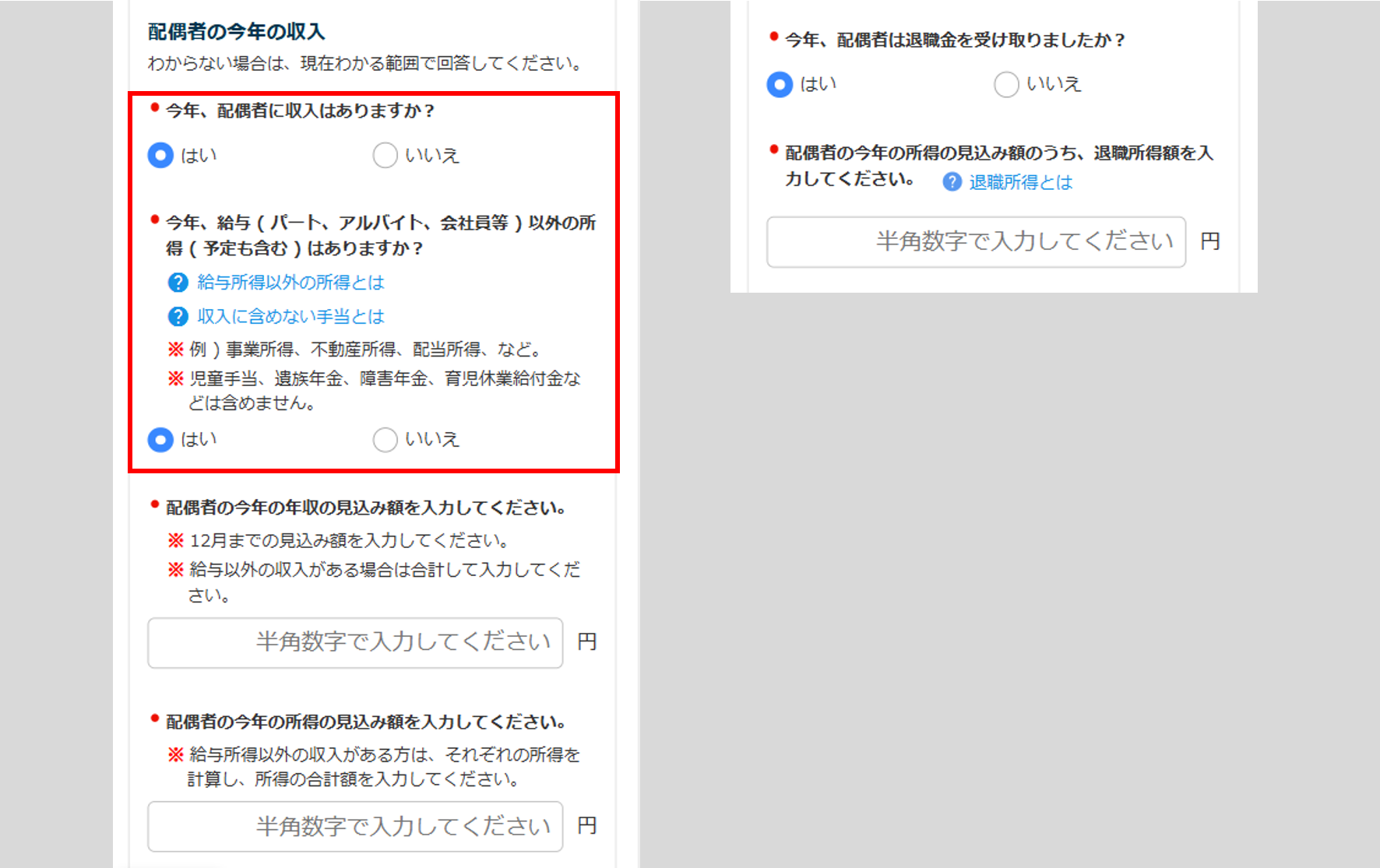 「配偶者の今年の年収の見込み額を入力してください。」「配偶者の今年の所得の見込み額を入力してください。」を入力します。「今年、配偶者は退職金を受け取りましたか?」に「はい」を選択した場合は、「配偶者の今年の所得の見込み額のうち、退職所得額を入力してください。」を入力します。