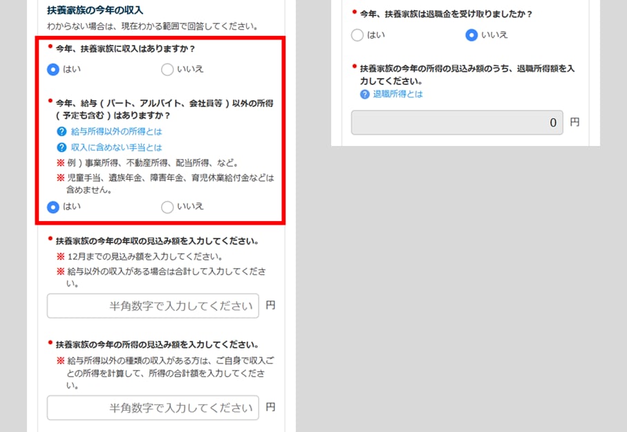 「扶養家族の今年の年収の見込み額を入力してください。」「扶養家族の今年の所得の見込み額を入力してください。」を入力します。「今年、扶養家族は退職金を受け取りましたか?」に「はい」を選択した場合は、「扶養家族の今年の所得の見込み額のうち、退職所得額を入力してください。」を入力します。