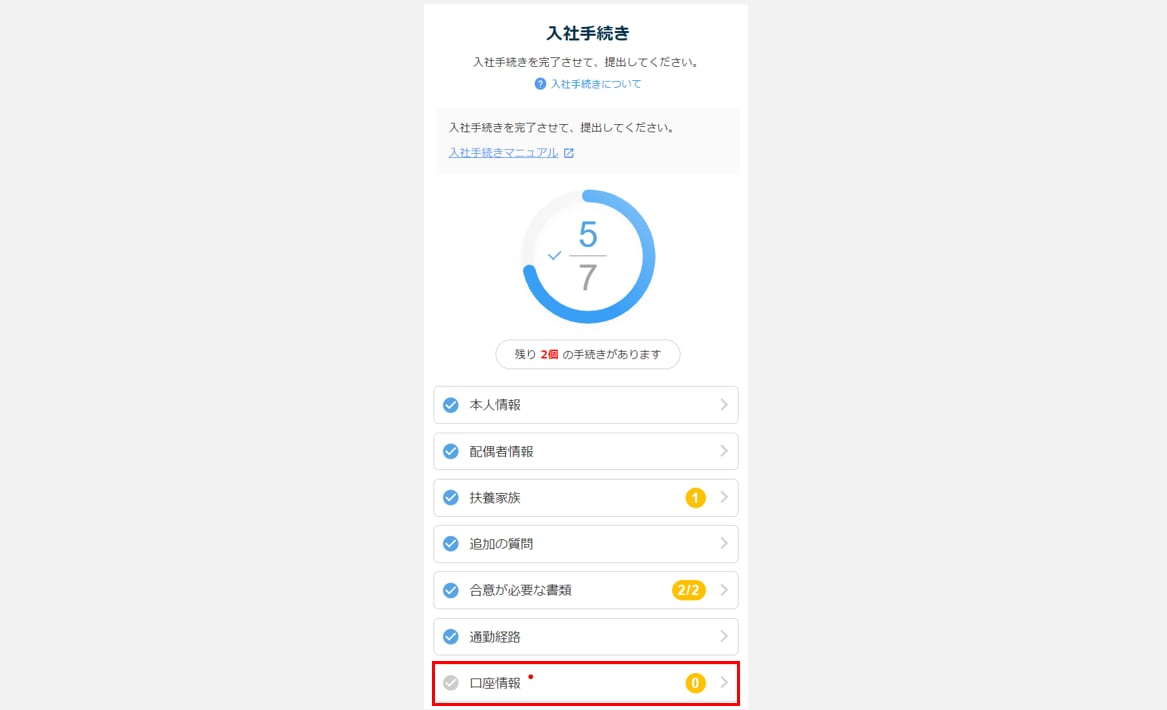 管理者から発行された入社手続きタスク内の口座情報の入力について説明します。