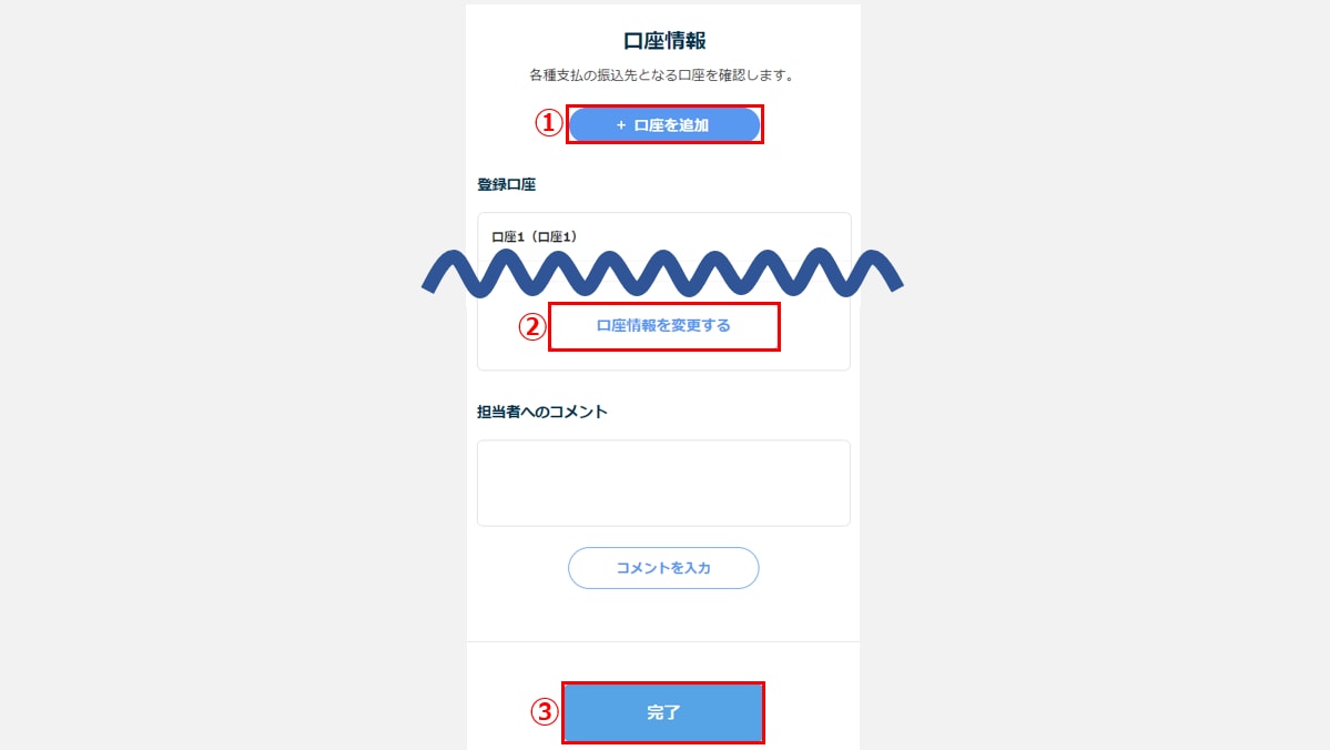 入力した口座情報を変更する場合は、[口座情報を変更する](②)をクリックします。