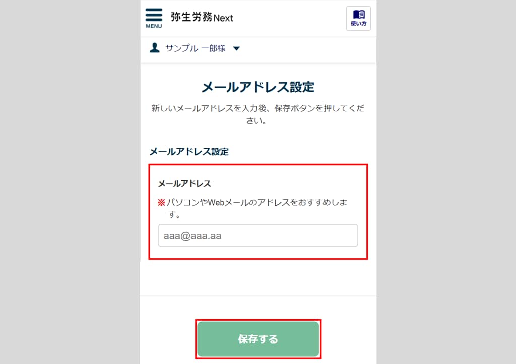 「メールアドレス」を入力し、[保存する]をクリックします。