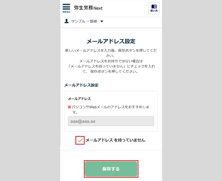 メールアドレスを持っていない場合は、「メールアドレスを持っていません」にチェックを入れ、[保存する]をクリックします。