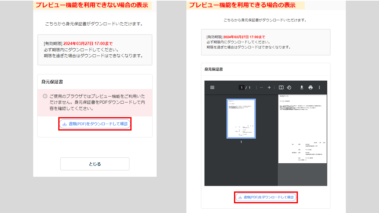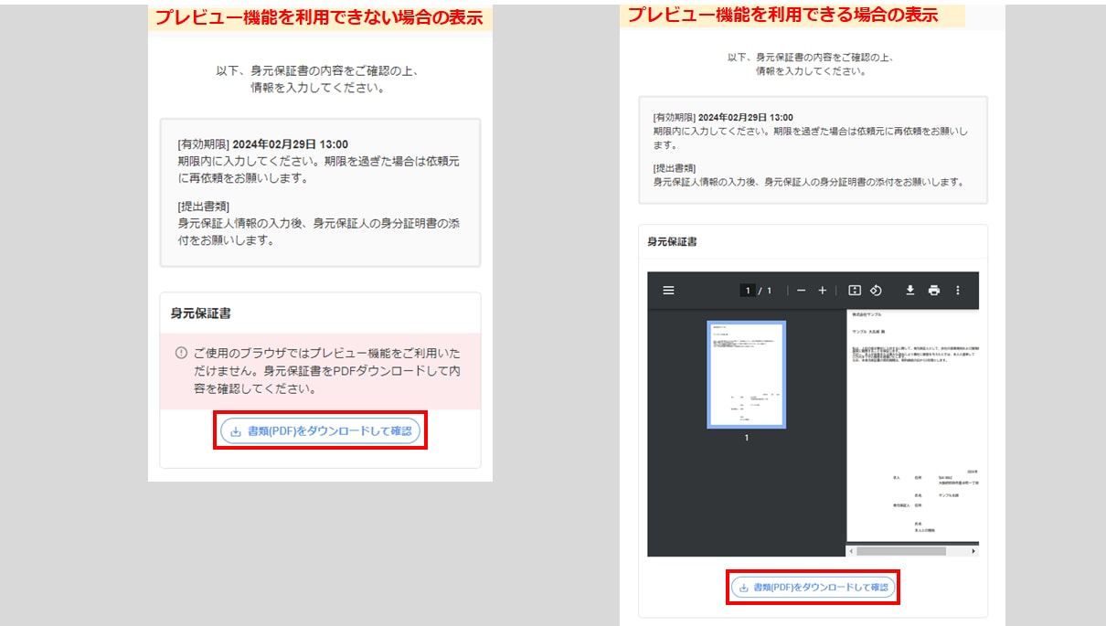 - 身元保証書の内容を確認します。※使用中のブラウザによっては、プレビュー機能をご利用いただけず書類の内容が表示されない場合があります。