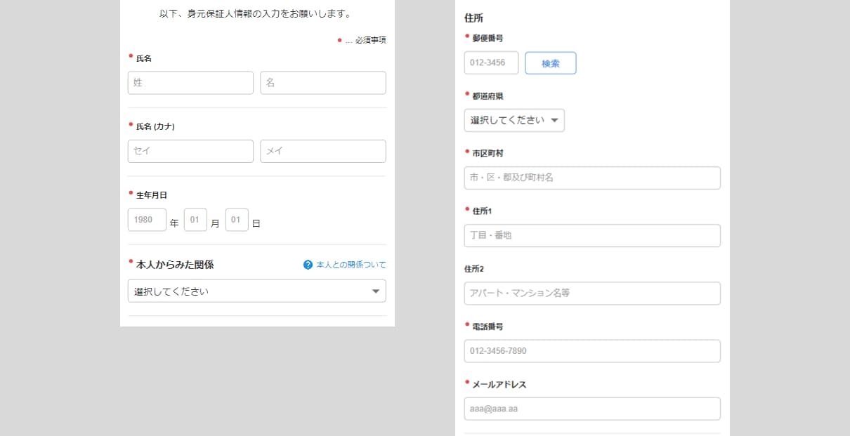 [書類(PDF)をダウンロードして確認]をクリックすると、PDFファイルにダウンロードできます。 - 身元保証人情報を入力します。
