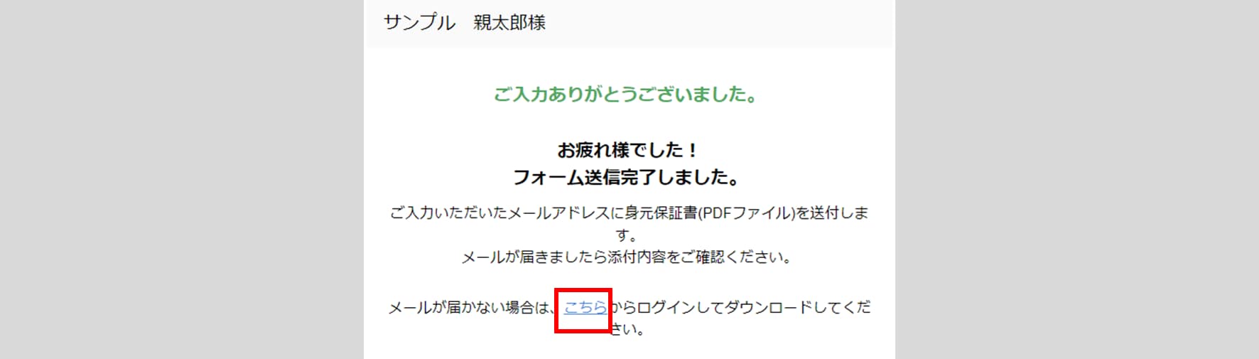 ご入力いただいたメールアドレスに身元保証書(PDFファイル)を送信します。メールが届かない場合は、[こちら]をクリックしてダウンロードしてください。また、依頼元に合意完了のお知らせメールを送信します。