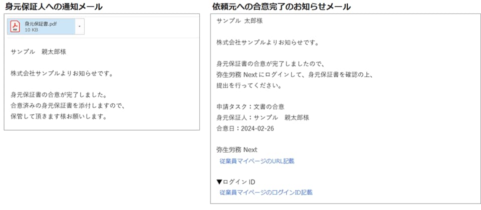 身元保証人への通知メールおよび依頼元への合意完了のお知らせメール サンプル