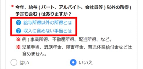 『?給与所得以外の所得とは』『?収入に含めない手当とは』のように、青文字で書かれた箇所をクリックすると、入力に役立つヒントが表示されますのでご活用ください。