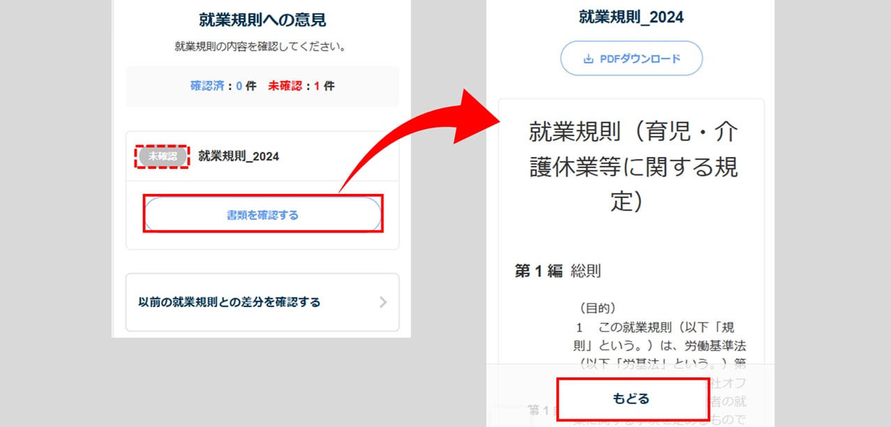- [書類を確認する]をクリックし、就業規則を確認します。確認後[もどる]をクリックすると、「未確認」が「確認済」に変更されます。※複数ある場合、すべて「確認済」にする必要があります。