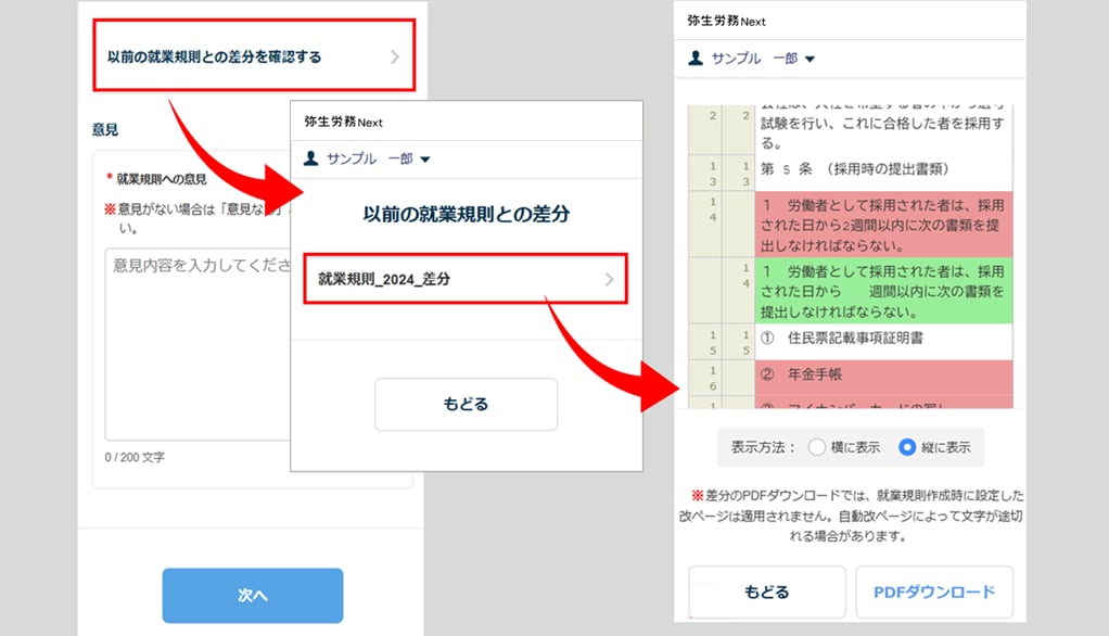 - 以前との差分を確認する場合は[以前の就業規則との差分を確認する]をクリック後、確認する差分をクリックします。差分が含まれる行に色がついて表示されます。背景色が緑色の行が以前の就業規則です。