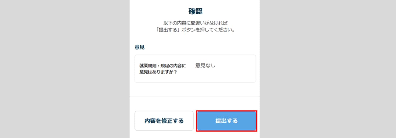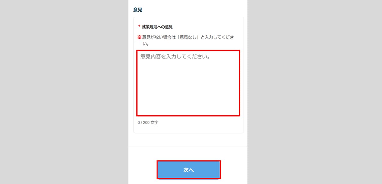 - 就業規則に対して意見がある場合、「就業規則への意見」に入力し、[次へ]をクリックします。※必須入力のため、意見がない場合は「意見なし」と入力してください。