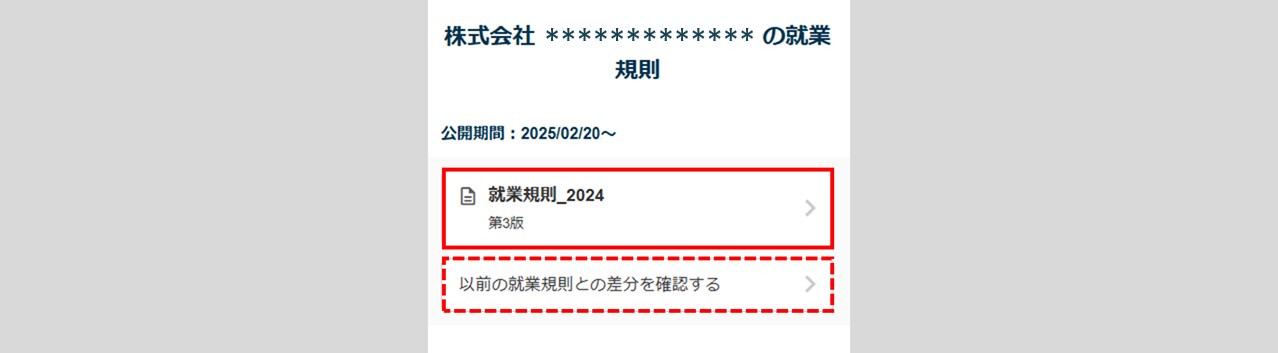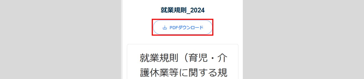 就業規則を公開された際に差分ファイルが添付されている場合は、[以前の就業規則との差分を確認する]から確認できます。 - 就業規則がプレビューで表示されます。[PDFダウンロード]をクリックすると、PDFファイルがダウンロードできます。※勤務先の就業規則の作成方法により、表示方法が異なります。PDF形式以外の場合は、プレビューが表示されず、ダウンロードのみ可能です。