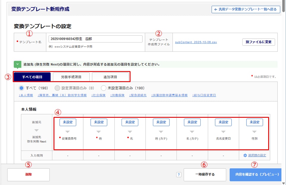 項目名を紐付けた場合でも、テンプレートの列が異なると該当の項目に反映されません。 - 「データの種類」が「本人」の場合