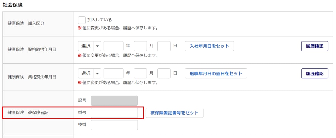 ※全国健康保険協会の加入者については、従業員台帳の「健康保険 被保険者証 番号」と「厚生年金整理番号」は、基本的に同一の番号で取得されているケースが多いので、同一番号を登録します。