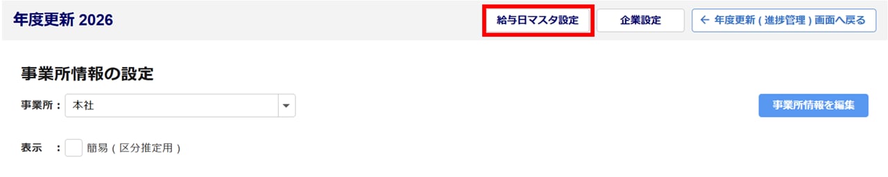 「給与日マスタ」設定方法 「年度更新 進捗状況」操作方法 - 画面上部に表示されている「年度更新の流れ」内の[区分確認と賃金集計]をクリックします。