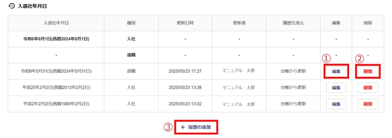 - 「入社・退職」情報が交互になるように、修正します。「日付」や「入社・退職」の種別情報の編集が必要な場合は、[編集]から編集(①)、不要な情報は[削除]から削除(②)、情報の追加が必要な場合は、[履歴の追加](③)から登録します。