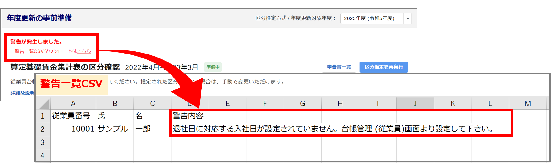 従業員台帳、本人情報カテゴリの「入社年月日」項目が未設定の場合に本警告が発生します。
