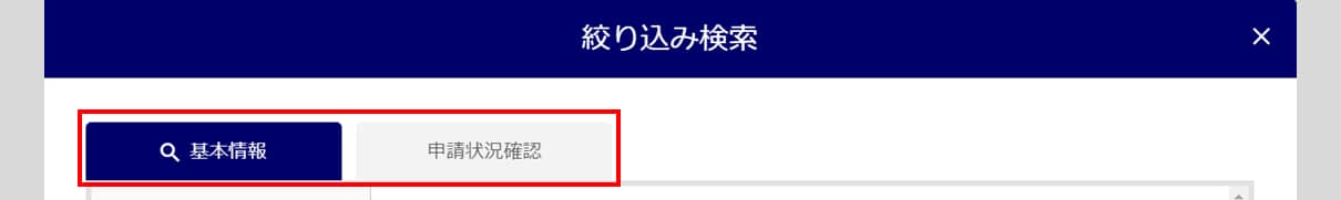 - 「基本情報」と「申請状況確認」の2つの方法で、絞り込みができます。「基本情報」と「申請状況確認」の2つの方法を併用して、絞り込むことも可能です。