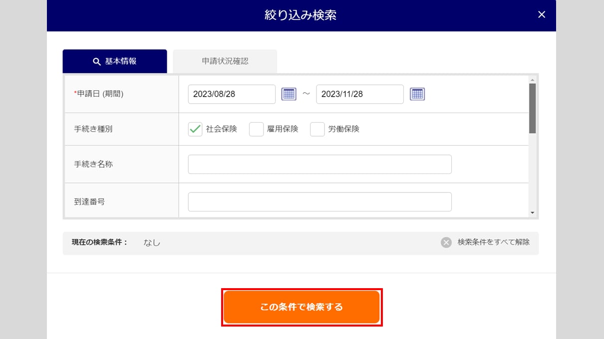 「申請日(期間)」や「手続き名称」「従業員名」などの絞り込みたい情報を設定します。
