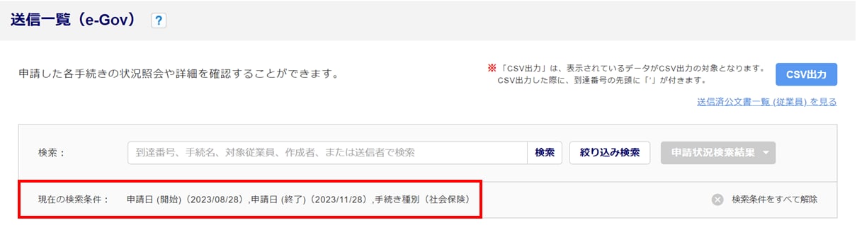 弥生労務 Nextにて電子申請をおこなった手続きの送信一覧の情報を絞り込む方法をご説明します。