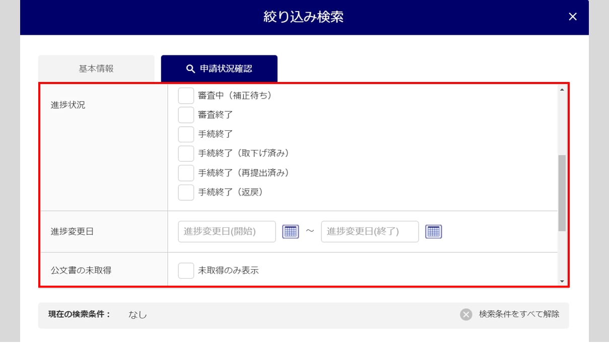 - 「進捗状況」や「公文書の未取得」「コメントの未取得」など、の絞り込みたい情報を設定します。