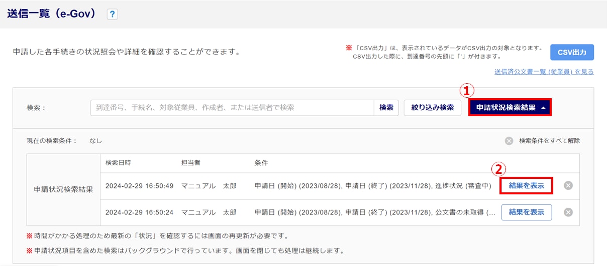 - [申請状況検索結果](①)>[結果を表示](②)をクリックします。