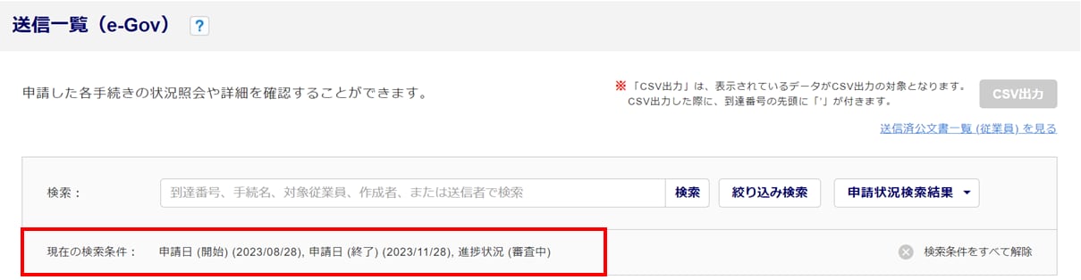 - [この条件で検索する]をクリックすると、「現在の検索条件」が表示され、絞り込んだ送信一覧の情報が表示されます。