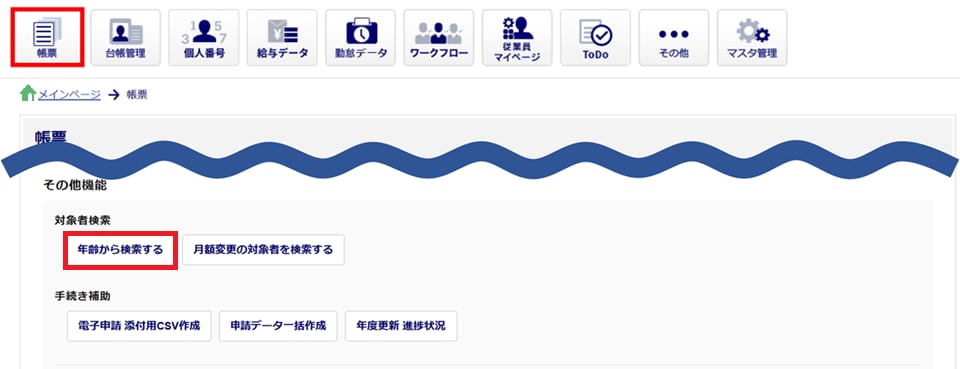 - [帳票]>その他機能、対象者検索の[年齢から検索する]をクリックします。