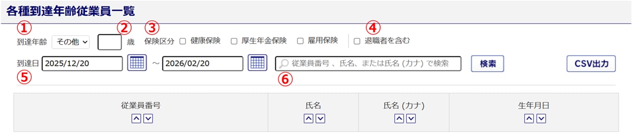 年齢を指定して検索する場合、年齢を入力します。3 保険区分 チェックした保険区分に加入している従業員が表示されます。 4 退職者を含む 検索対象に退職者を含む場合、チェックします。 5 到達日 「1.到達年齢」に設定した年齢に到達する日を設定します。