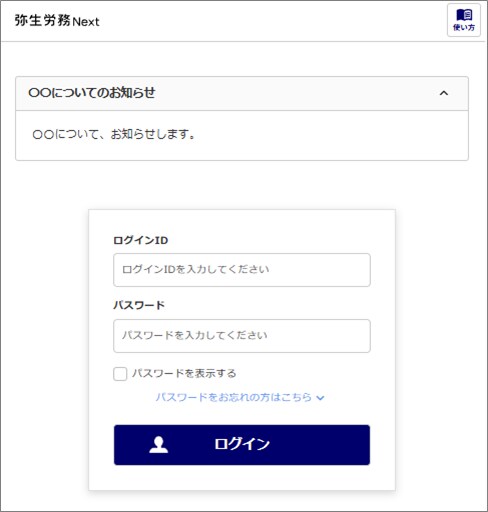 従業員マイページのログイン画面に、従業員へ向けて企業独自のお知らせを掲載することができます。
